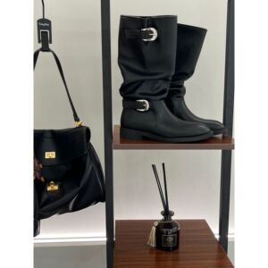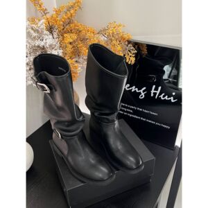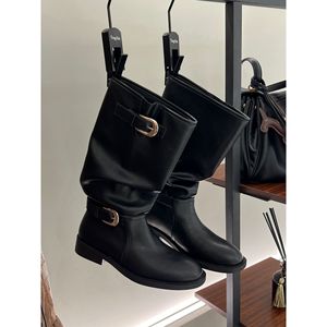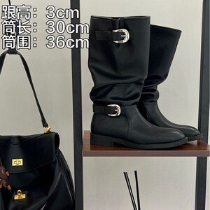 芭慕秀2025秋冬新款真皮厚底骑士靴女中筒靴粗跟高筒长靴堆堆靴女