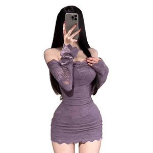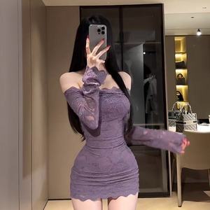 夏季新款一字肩紫色长袖连衣裙修身收腰包臀裙风显瘦短裙子