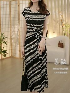 韩系名媛绑带收腰黑色连衣裙2025夏季新款时尚洋气印花短袖A字裙