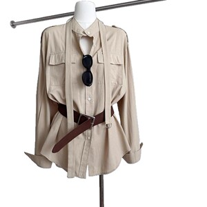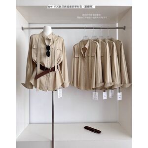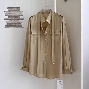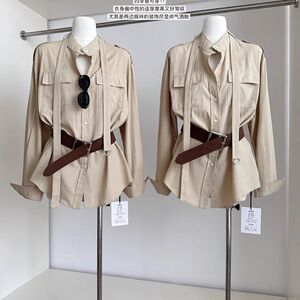 美式休闲酷飒卡其立领飘带系扣腰带长袖衬衣女秋口袋工装上衣外搭