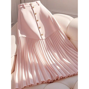 今年流行独特漂亮梨型身材高腰遮胯显瘦粉色拼接百褶字半身裙女