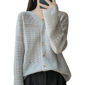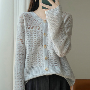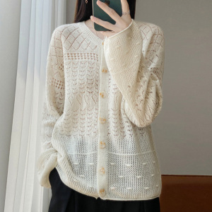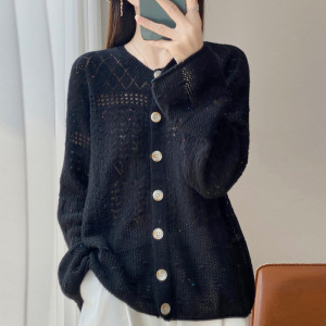 新款秋冬100羊毛开衫女圆领手工钩花外套舒适保暖宽松慵懒风毛衣