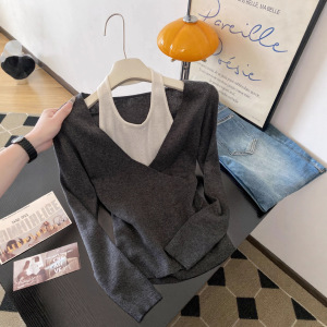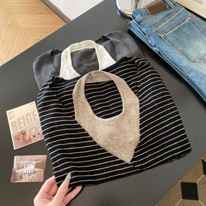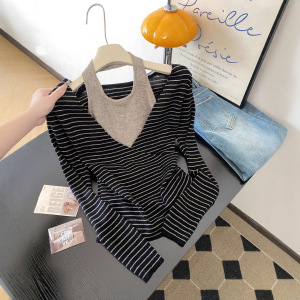 十三行高货爆款~打底衫女高级假两件条纹针织长袖独特绝美小上衣