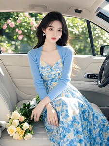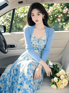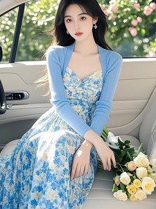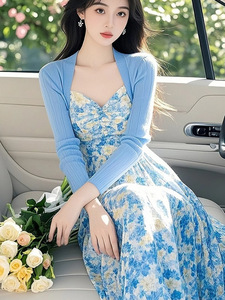 浅秋搭配一整套2025超火超好看小香风蓝色针织衫碎花吊带裙两件套