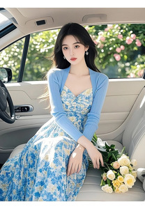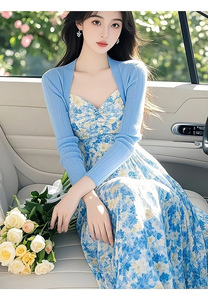 套装(蓝色开衫+碎花裙)