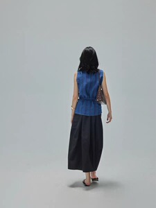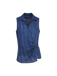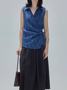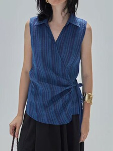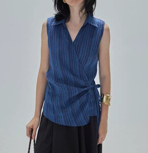 亚麻条纹无袖衬衫夏季系带收腰法式小资小上衣