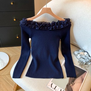 广州十三行高货爆款~荷叶边露肩针织衫小众纯欲显瘦一字肩毛衣女