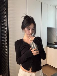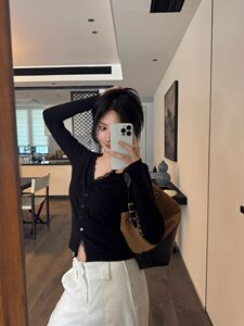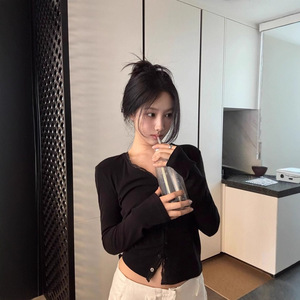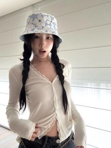 白色蕾丝拼接v领长袖T恤女秋季设计感修身开衫单排扣纯欲百搭上衣