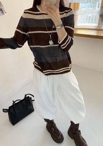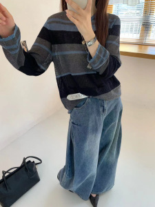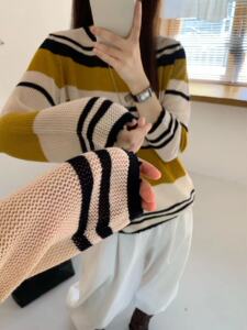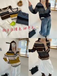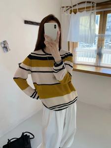 韩系圆领撞色条纹长袖微透细羊毛针织衫女2025早秋新款宽松上衣薄
