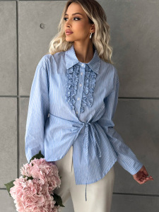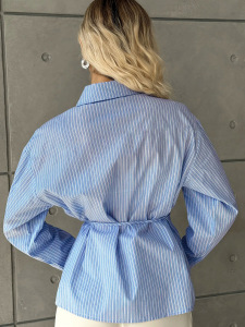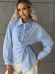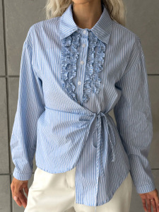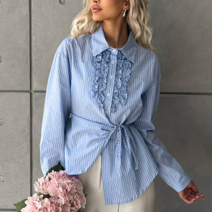 秋季木耳边设计感蓝色条纹女式衬衫收腰系带不规则轻奢高级感上衣