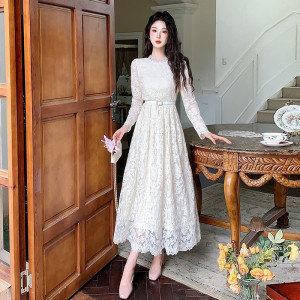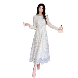 2025跨境优雅气质镂空刺绣圆领钉珠长袖收腰蕾丝连衣裙女