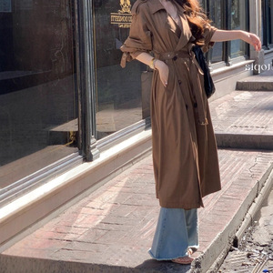 2025法式名媛咖色翻领双排扣麂皮风衣女复古设计长款经典系带外套