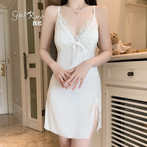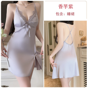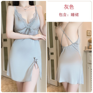DZ瑰若轻奢舒适冰丝火辣开叉露背可拆胸垫睡裙女家居服套装XK5734