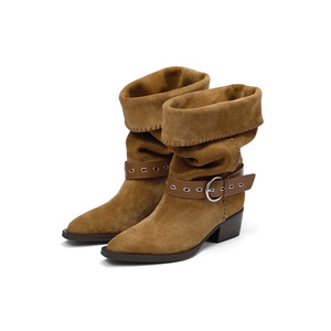 钟楚曦同款真皮堆堆靴女西部牛仔靴复古中筒骑士靴褶皱尖头短靴