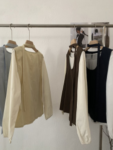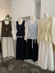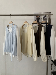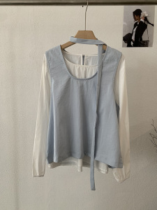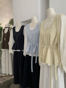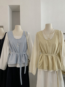 欧玛莱 百搭配腰绳圆领长袖内搭衬衫+纯色背心显瘦上衣两件套4529