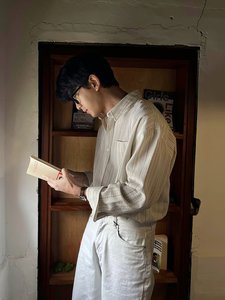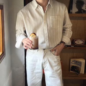 美式复古条纹衬衫男肌理感宽松长袖单口袋开衫阿美咔叽工装衬衣潮