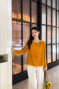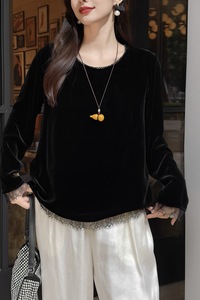 2025秋款法式真丝丝绒上衣领口钉珠下摆拼接蕾丝纽结设计显瘦衬衫