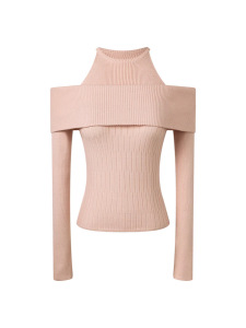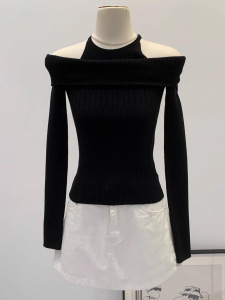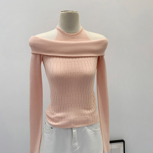 粉色露肩假两件长袖针织衫女秋新款韩系甜辣妹软糯一字肩内搭毛衣