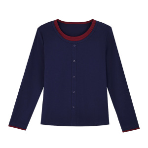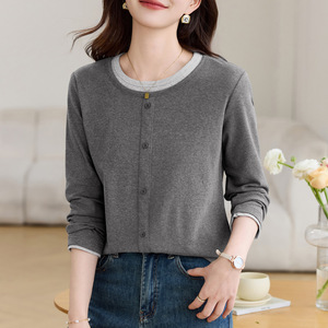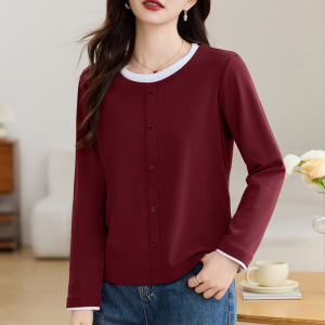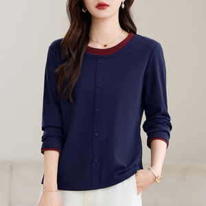 假两件正肩长袖t恤女春秋季2025年新款撞色圆领修身拼接体恤上衣