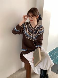 韩国chic秋冬复古减龄单排扣别致圣诞提花百搭长袖针织毛衣外套女