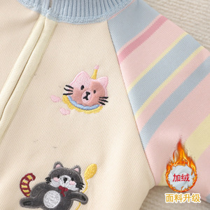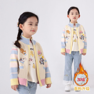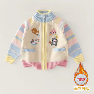女童毛衣秋冬新款中大童针织拉链开衫加绒刺绣卡通一体绒