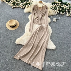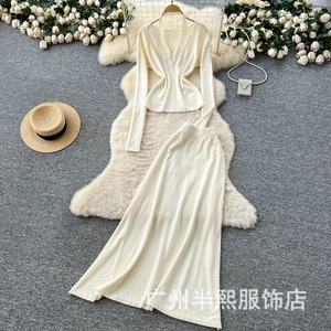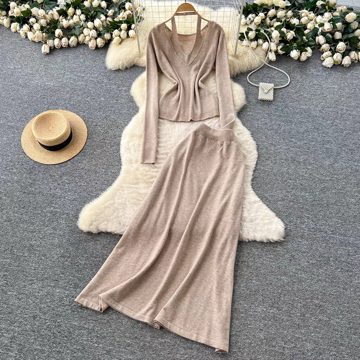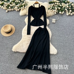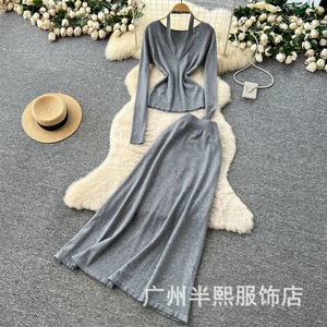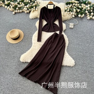 原版设计挂脖V领针织衫套装女时尚纯欲宽松百搭收腰毛衣半身裙