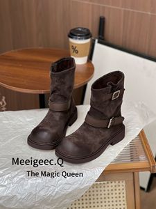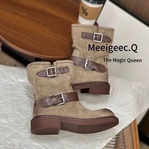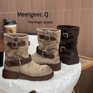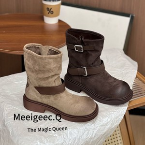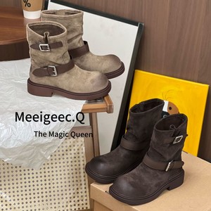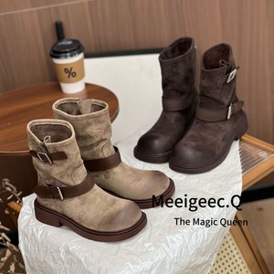 复古磨砂烟筒粗跟短靴女2025新款爆款套筒切尔西靴厚底圆头马丁靴