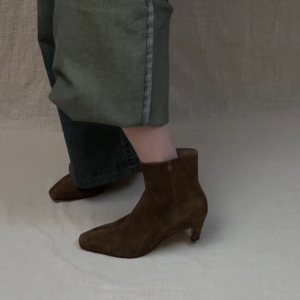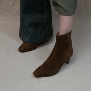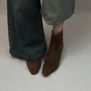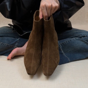 牛皮版~复古极简小猫跟方头瘦瘦靴女绒面侧拉链细跟通勤高跟短靴