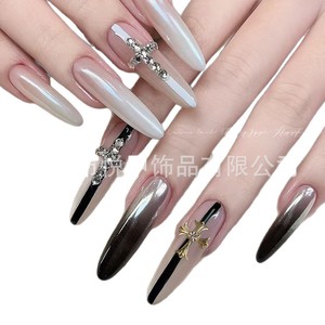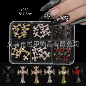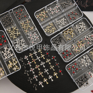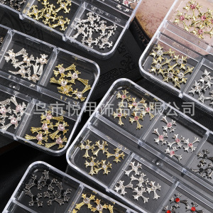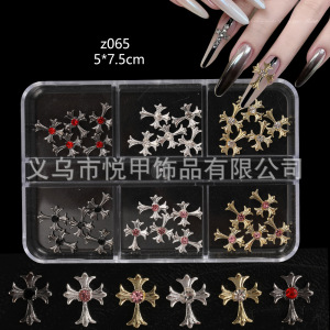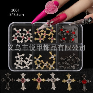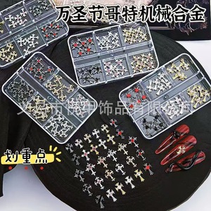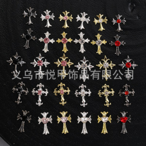 暗黑朋克风6格合金克罗心美甲饰品金属质感镶 水钻十字架美甲饰品