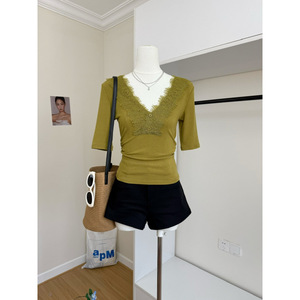 塞纳显白美t 2025夏季新款蕾丝拼接V领短中袖修身打底T恤上衣女