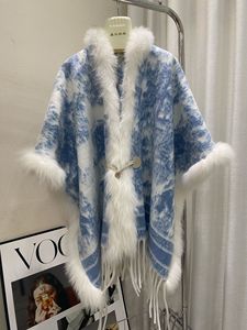 2025优雅气质水墨画披肩流苏边仙气斗篷大狐狸毛领高级感皮草外套