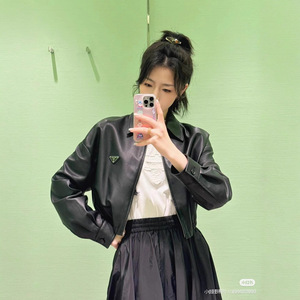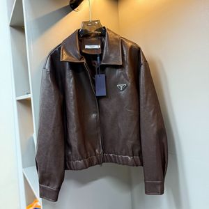潮牌25ss秋冬新款黑色金属三角标翻领皮衣外套拉链黑色深咖两色