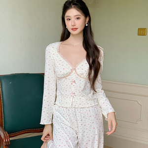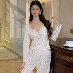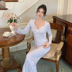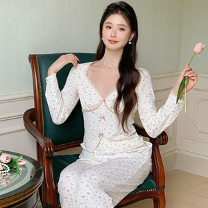 法式睡衣新款秋季花边V领睡衣套装长袖长裤甜美棉质可外穿家居服