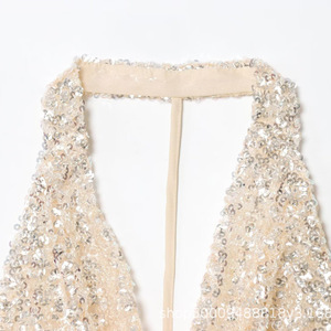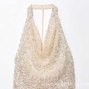 跨境外贸2025夏季新款法式气质名媛珠片亮片露背挂脖背心上衣