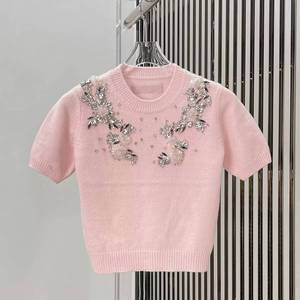 25MIU早秋新款重工钉钻刺绣甜美少女风套头短袖圆领毛衣女针织衫