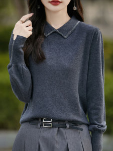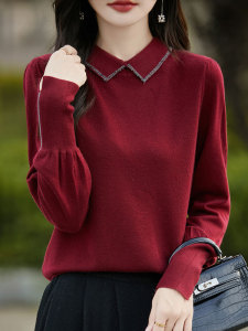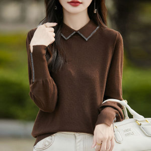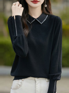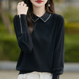 【厂家直供】春秋新款翻领针织内搭女士纯色烫钻显瘦毛衣打底衫