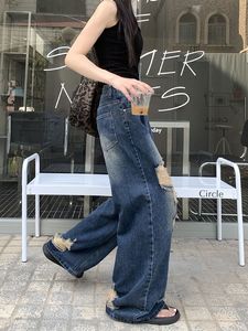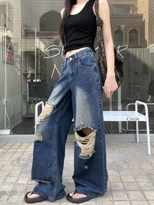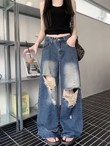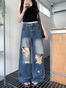 【韩牛】小个子美式复古辣妹破洞牛仔裤女新款宽松高腰显瘦阔腿裤