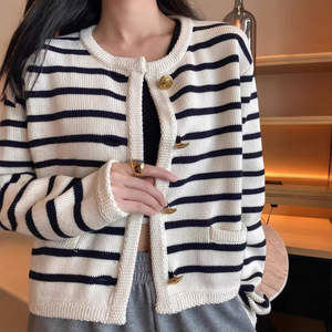 法式风金扣撞色条纹针织开衫女秋冬宽松短款圆领外搭毛衣外套