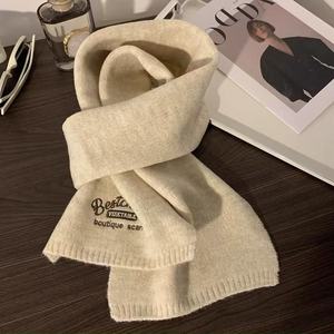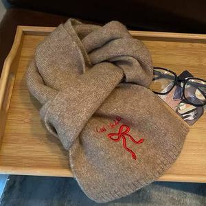 网红学院风仿羊绒围巾2025冬季新款纯色时尚刺绣蝴蝶结情侣围巾