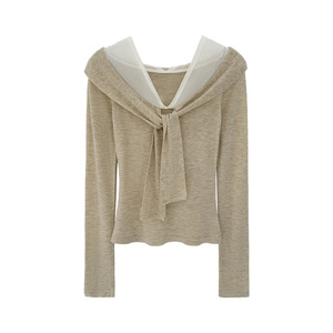 热销网纱拼接一字领飘带长袖针织衫女2025早春新款独特别致上衣