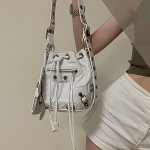 2025新款褶皱牛皮抽绳水桶包三合一铆钉机车包时尚潮流单肩斜挎包