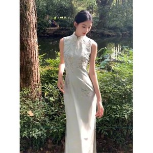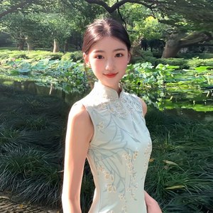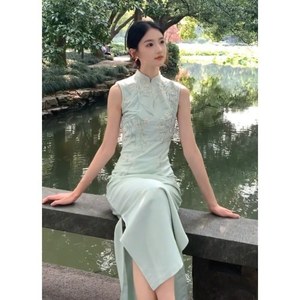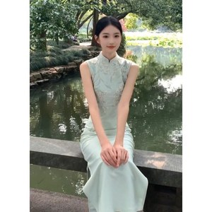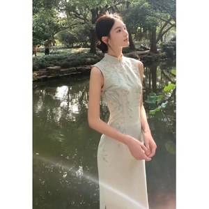 豆绿色无袖 旗袍
