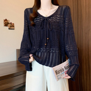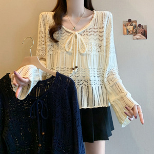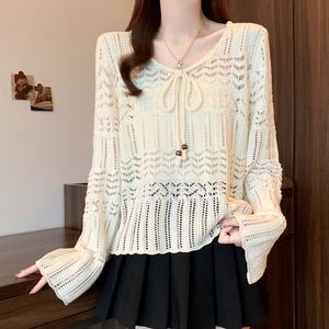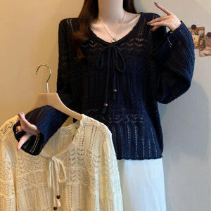 镂空V领长袖针织罩衫女2025早秋新款宽松显瘦设计感系带上衣A6510