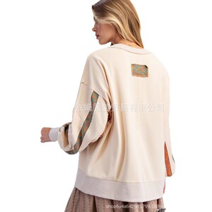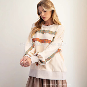 亚马逊25秋季新款跨境欧美女装印花拼接圆领套头卫衣休闲上衣女