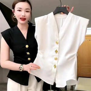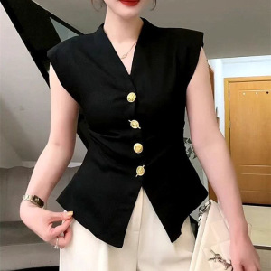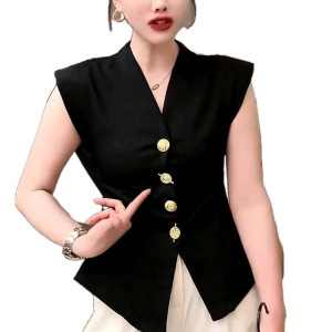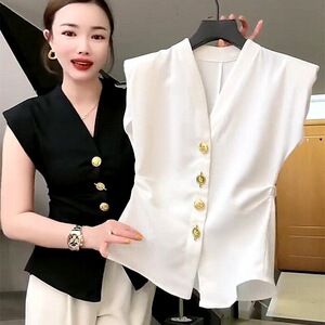 法式复古高级西装马甲女欧货夏洋气V领修身收腰重工纽