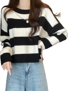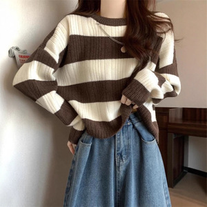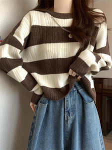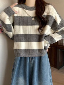 韩系撞色圆领条纹长袖针织衫女秋冬季显瘦宽松套头短款打底衫上衣