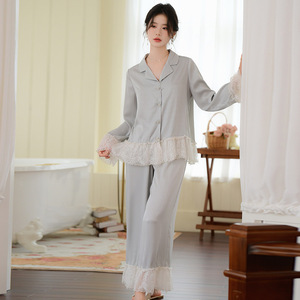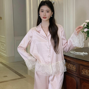 法式睡衣女士长袖长裤甜美公主风色丁套装秋季睡衣家居服可外穿