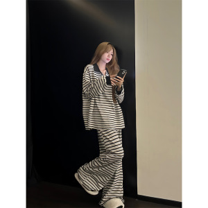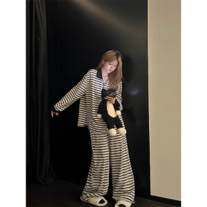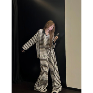 ins韩版慵懒风长袖睡衣女春秋款2025新款条纹长裤家居服休闲套装