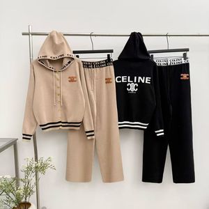 跨境时尚连帽字母印花开衫外套松紧腰阔腿裤针织两件套休闲百搭
