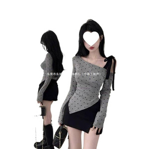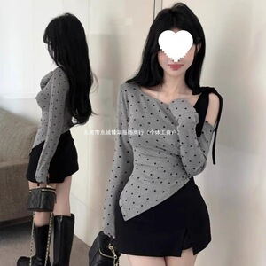 韩系别致纯欲减龄绑带斜肩上衣辣妹设计感波点不规则打底长袖恤